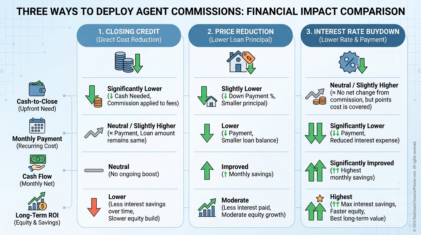 When I model this in The World’s Greatest Real Estate Deal Analysis Spreadsheet™, I compare three paths: take the commission as a closing credit, use it to reduce price, or buy down the rate.