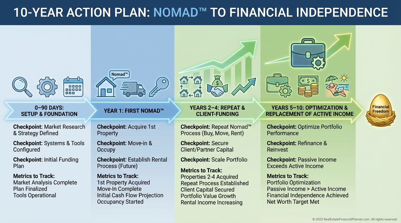 First 12 months, close your first owner-occupant Nomad™, document the process, and host one investor workshop using your numbers.