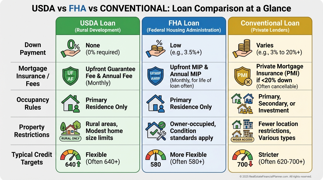 When I help clients break into ownership in rural and exurban markets, USDA loans are often the only true zero-down path that still delivers competitive rates.