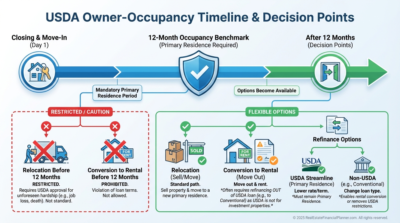 My playbook for Nomad™ clients is to refinance to a conventional loan before converting the home to a rental. That removes the USDA annual fee and avoids program-intent conflicts.