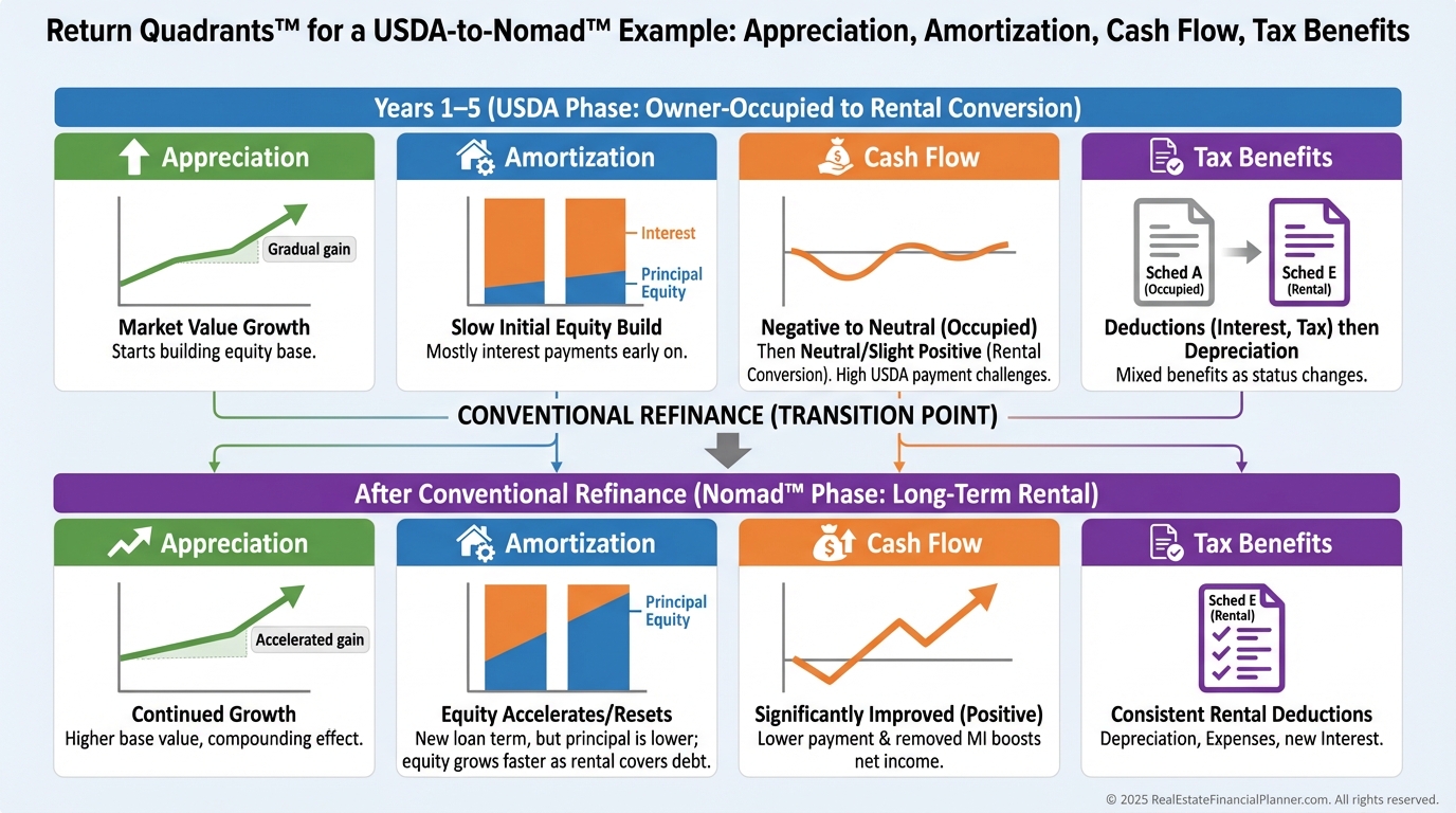 Track Return Quadrants™ monthly: appreciation, amortization (debt paydown), cash flow (often negative if converted), and tax benefits.