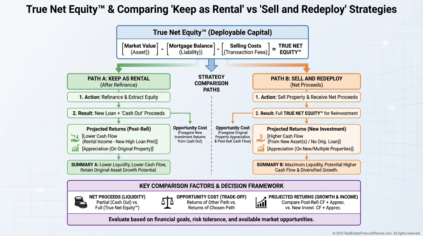 Before converting, I calculate True Net Equity™ by subtracting selling costs, payoff, and taxes from an updated value. Then I ask: does keeping it as a rental beat selling and redeploying?
