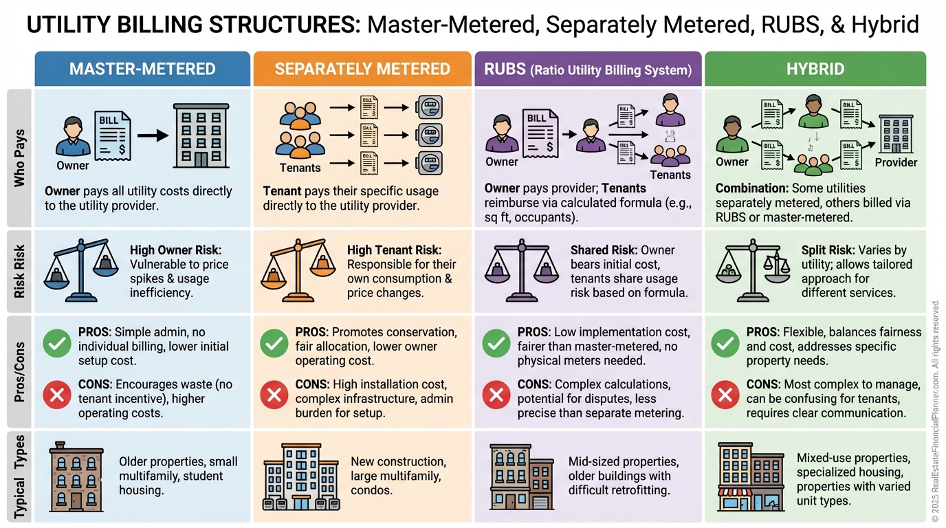 Master-metered puts all consumption risk on you. It’s common in older small multis and makes underwriting harder but management easier.