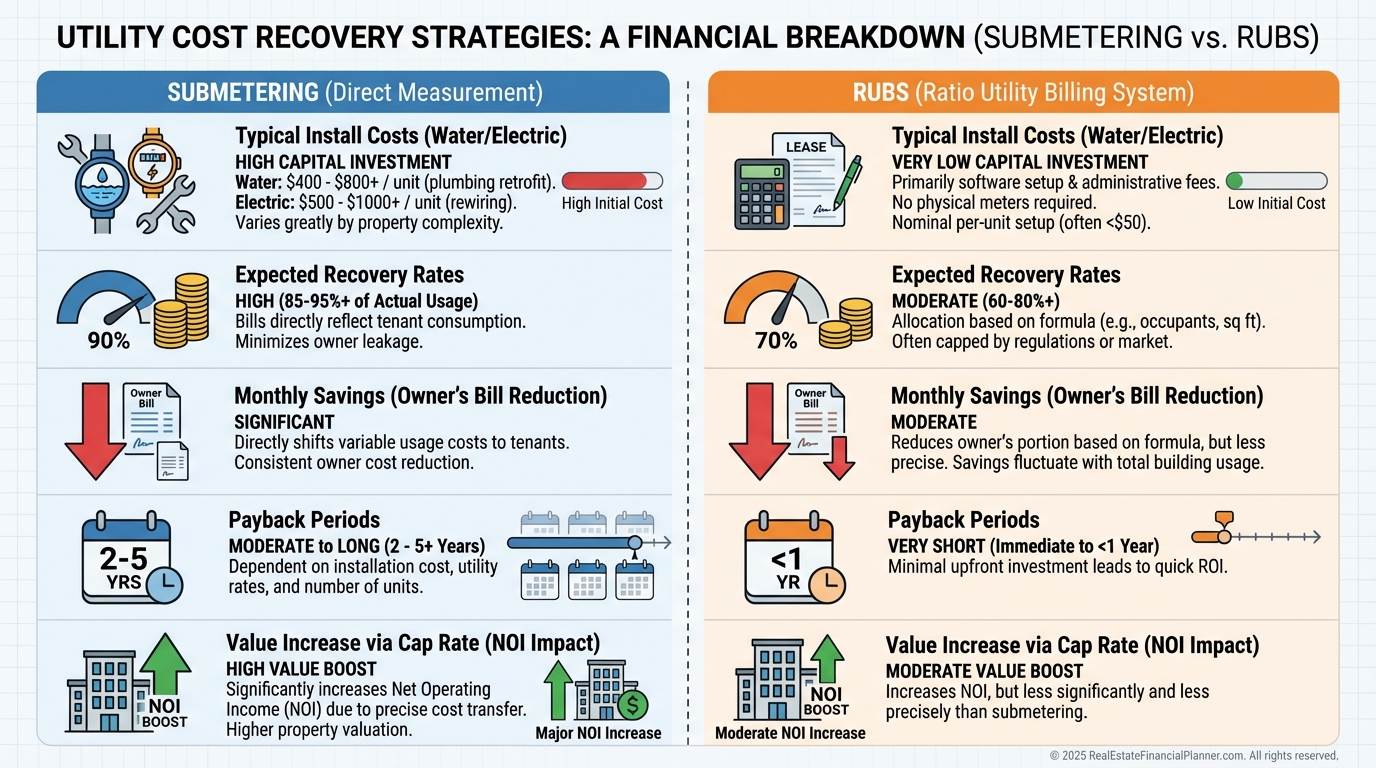 RUBS—Ratio Utility Billing System—allocates costs by square footage, occupants, or fixtures. It’s a legal, low-cost way to recover 80–90% without full submetering in many markets.