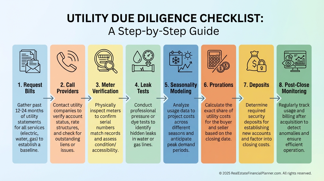 For acquisitions, never write an offer without at least 12 months of utility data. Verify meters during inspection. Call providers for usage history. Bake a 5% annual increase into your pro forma.