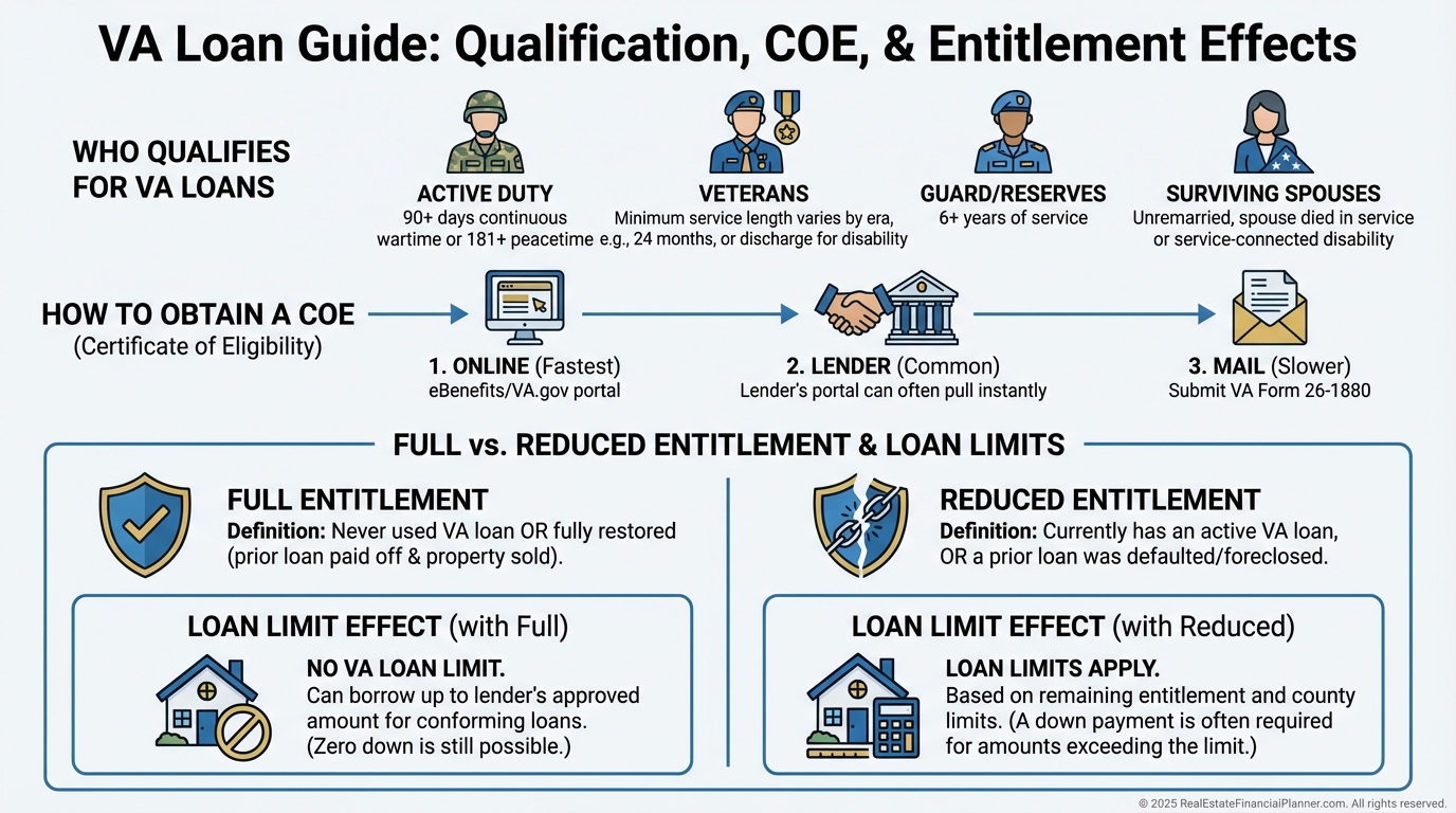 VA loans are a benefit for eligible veterans, active-duty service members, certain Guard/Reserve members, and qualifying surviving spouses.