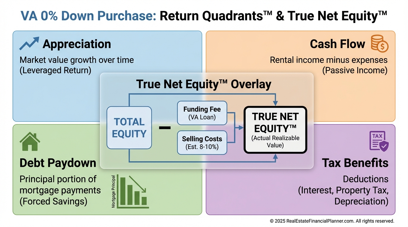I also track True Net Equity™ after paying selling costs and your loan payoff. Your first year’s equity includes principal paydown and any appreciation minus the funding fee you financed.