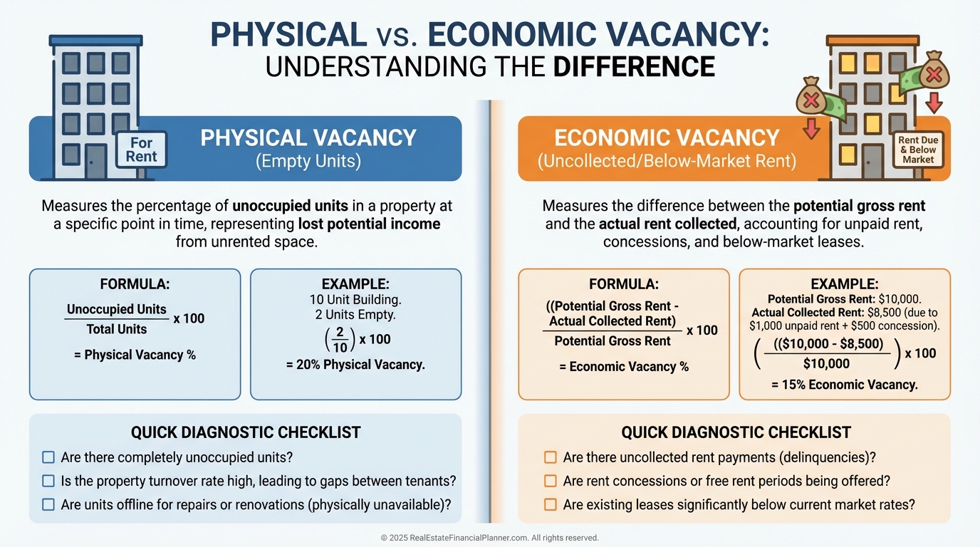 Economic vacancy is the income you should have collected but didn’t—concessions, bad debt, or under-market rents.