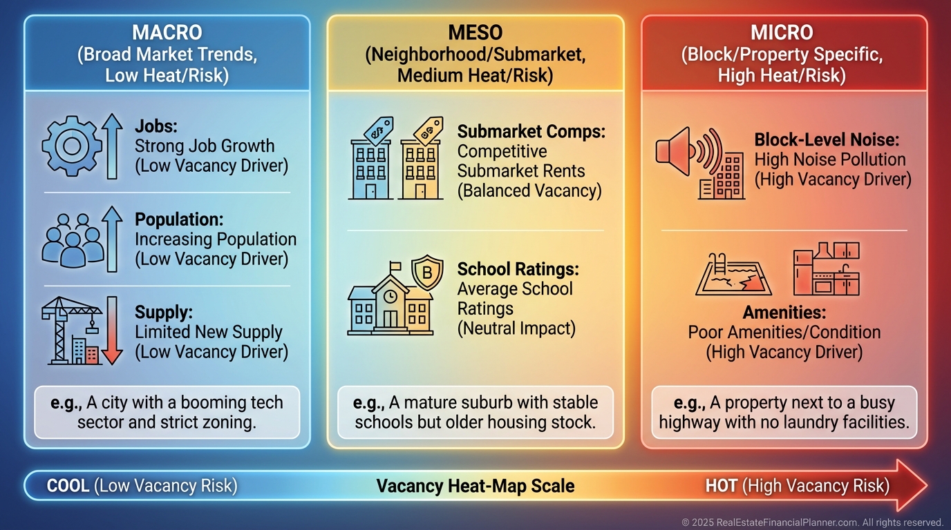 Micro-markets within the same zip can differ by 5–10% vacancy based on crime, amenities, and noise.