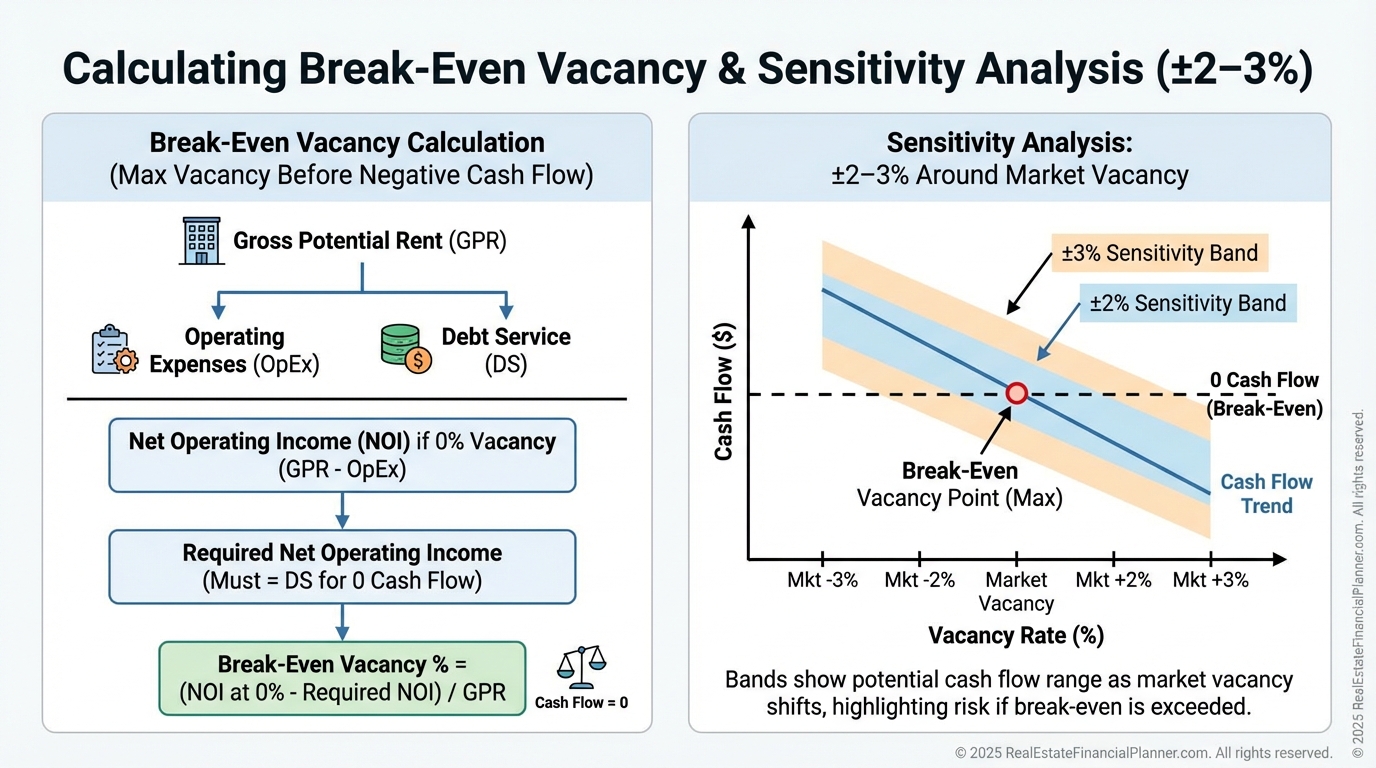 Then I test break-even: the highest vacancy where cash flow stays positive.