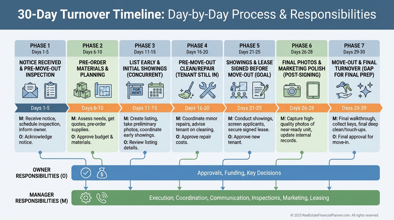 Implement a 30-day turnover playbook and pre-list with “coming soon” photos during the final week.