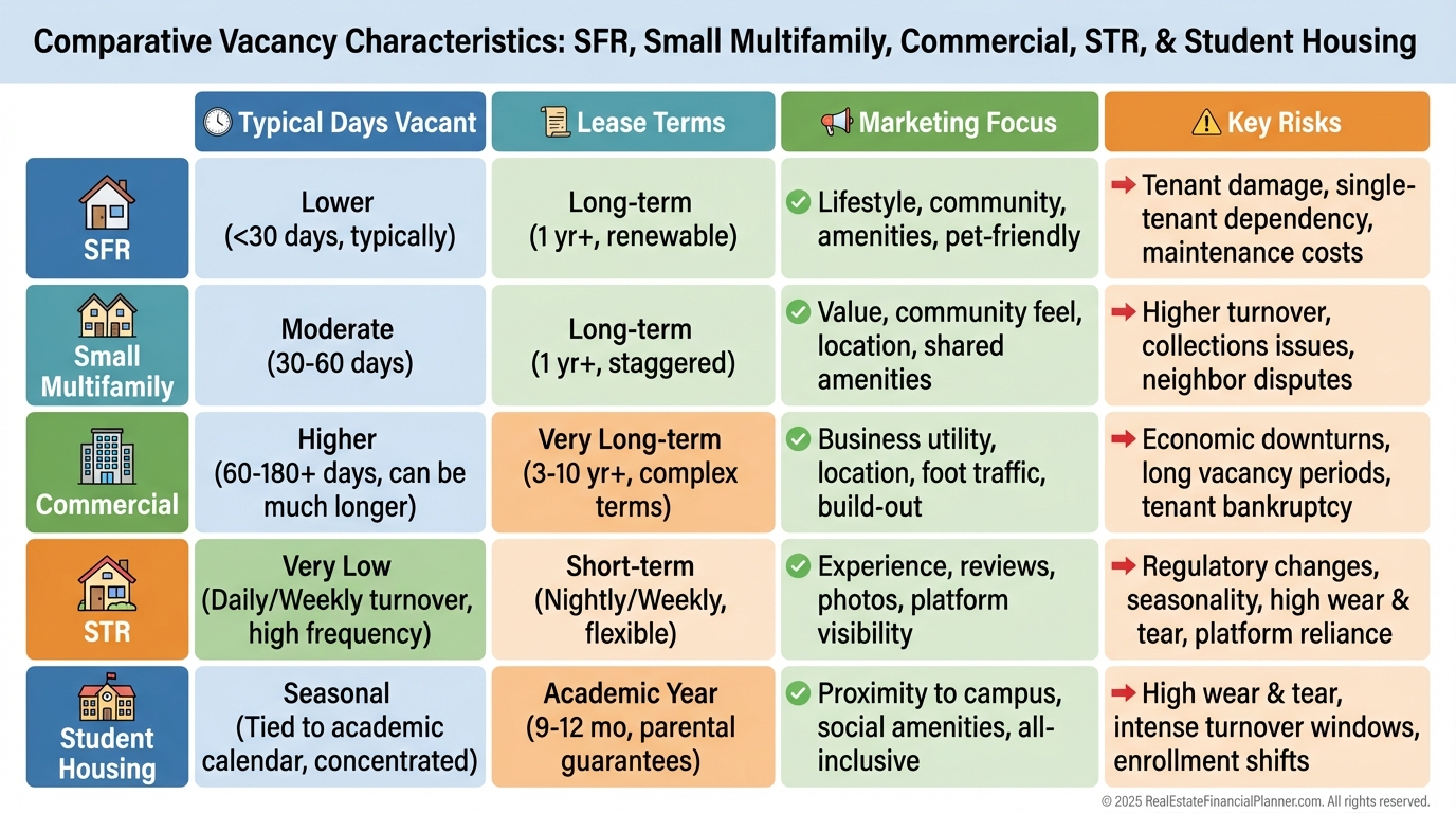 Commercial can sit for 6–12 months; plan for TI allowances and longer lead times, offset by longer leases.